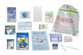 ●携帯用持出袋、ウイルス感染対策の台紙、防災のしおり、IDカード、石鹸、歯ブラシセット、マスク、ポケットティッシュ、ポリエチレン手袋、除菌シート、携帯トイレ、レインコート、エマージェンシーシート、マウスウォッシュ